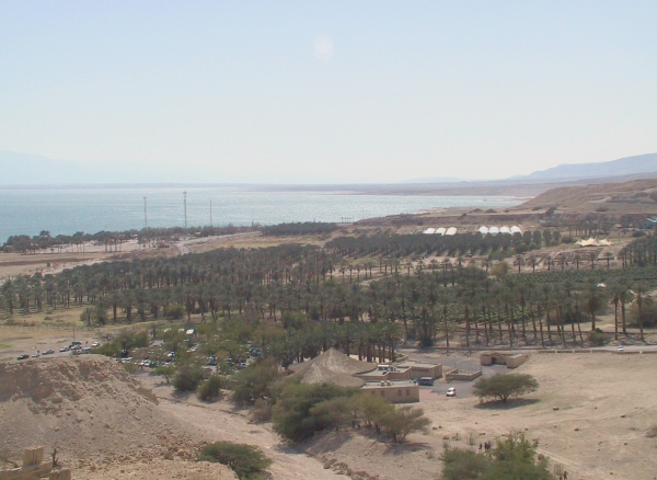 view of the Dead Sea and the new date-palm plantations in the plain
