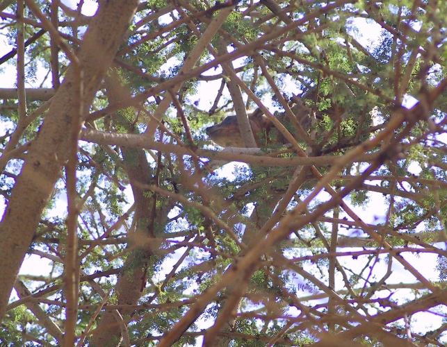 The hyrax hiding in a thicket of trees having been chased there.