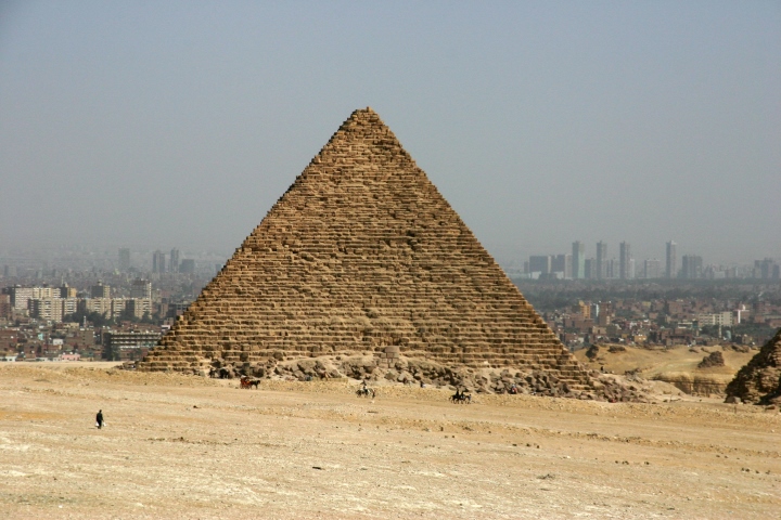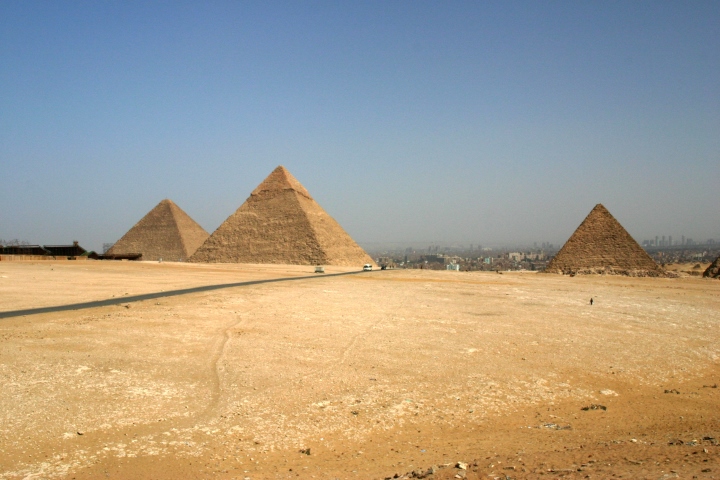 Giza Pyramids: view from western desert side, looking towards Cairo