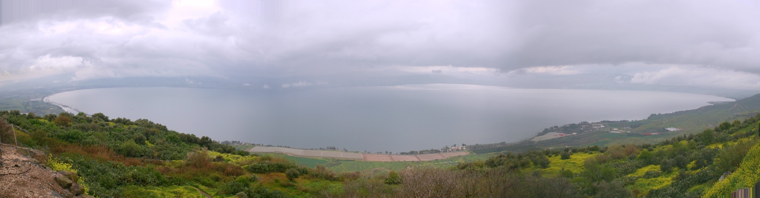 Panorama of the Sea of Galilee from a high lookout on the Golan Heights in Israel (south is left, north is right, looking westward). It was a dark and overcast day. A short break in the rain and fog enabled this photo.