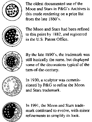 History of the original logo and founders The P&G trademark originated around 1851, when many products did not carry a visible brand name, as a symbol for Star brand candles. This way, even people who could not read could see P&G's trademark and know they would get consistent quality. The original trademark was refined into a star which multiplied into thirteen stars for the 13 original American colonies and a man-in-the-moon, a popular decorative fancy of the 1800's. P&G management recognized the importance of the man-in-the-moon element when they eliminated it from the trademark in the 1860's. A merchant "down river" rejected a shipment of Star Candles, an early P&G product, which carried the modified trademark. He chided the Company by letter for sending imitations. The moon promptly went back into service, and the trademark was officially registered with the U.S. Patent Office in 1882. Some of their variations (from P & G) are as follows...